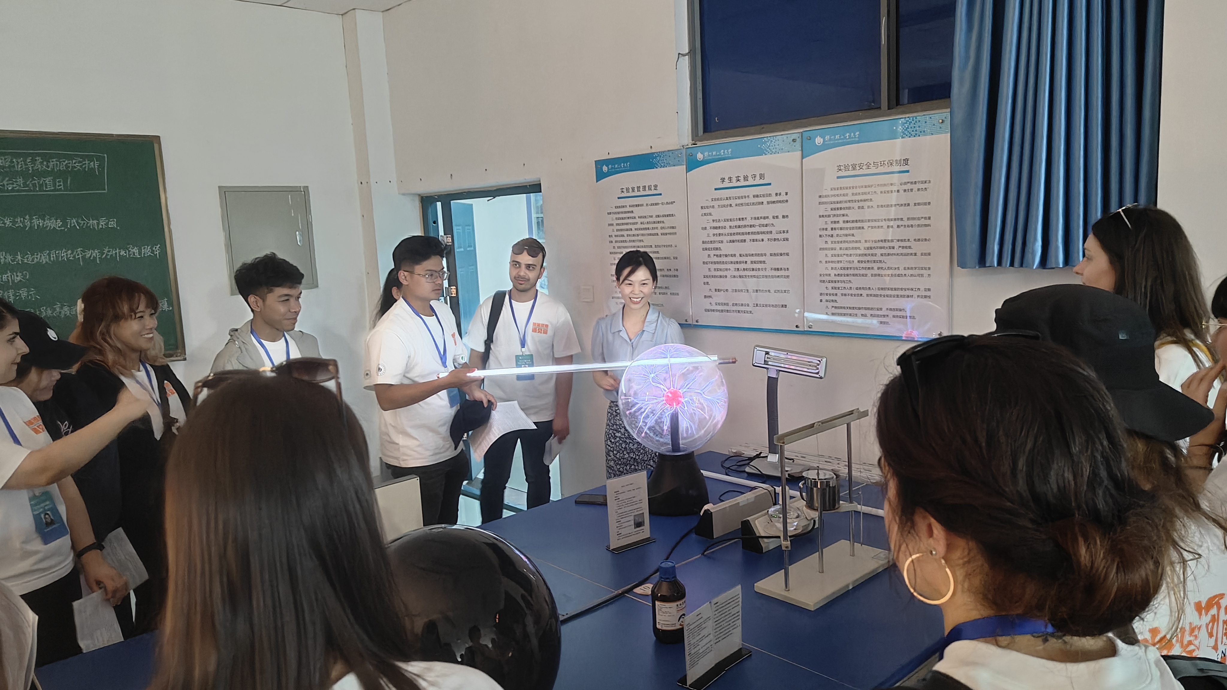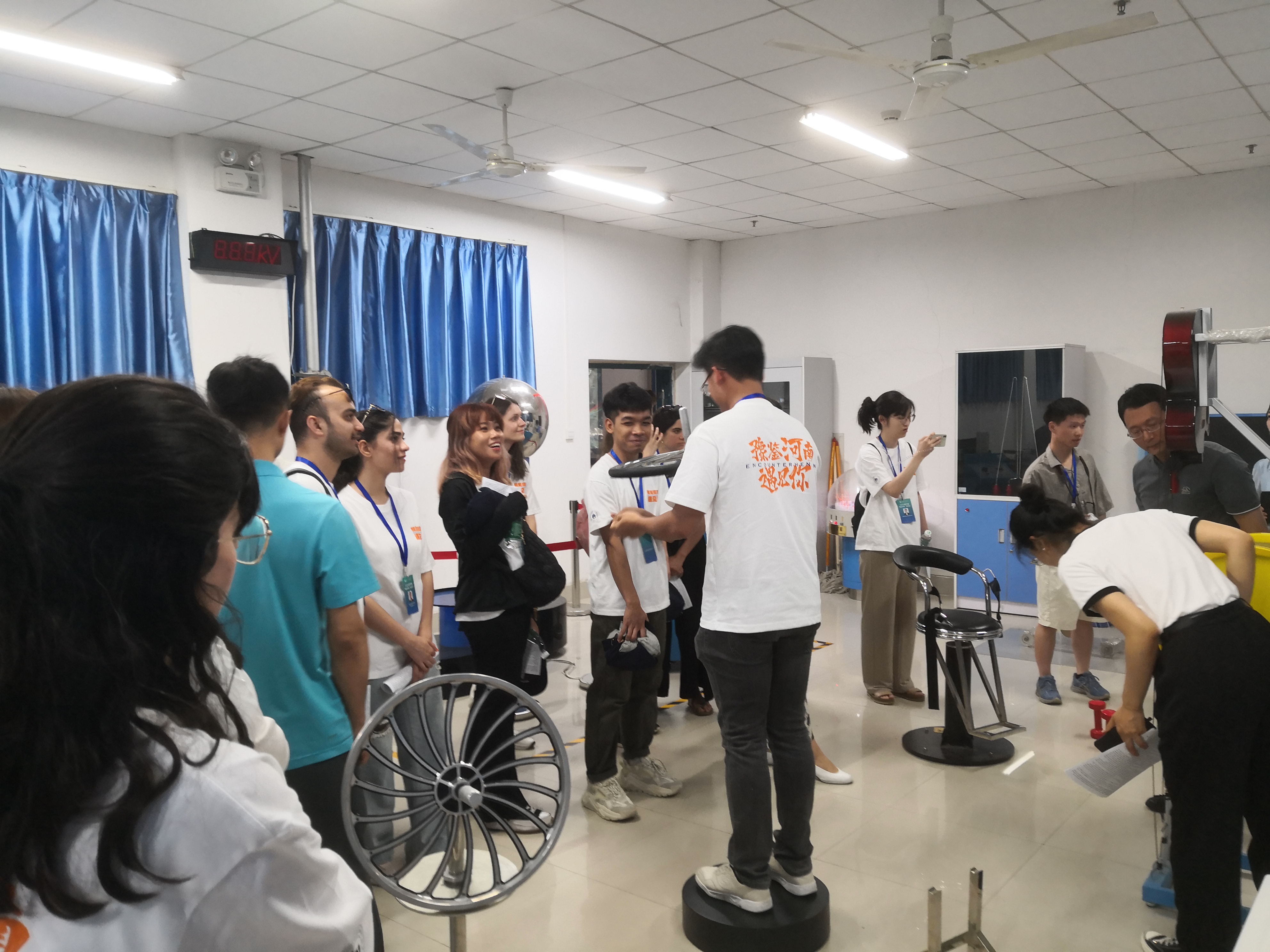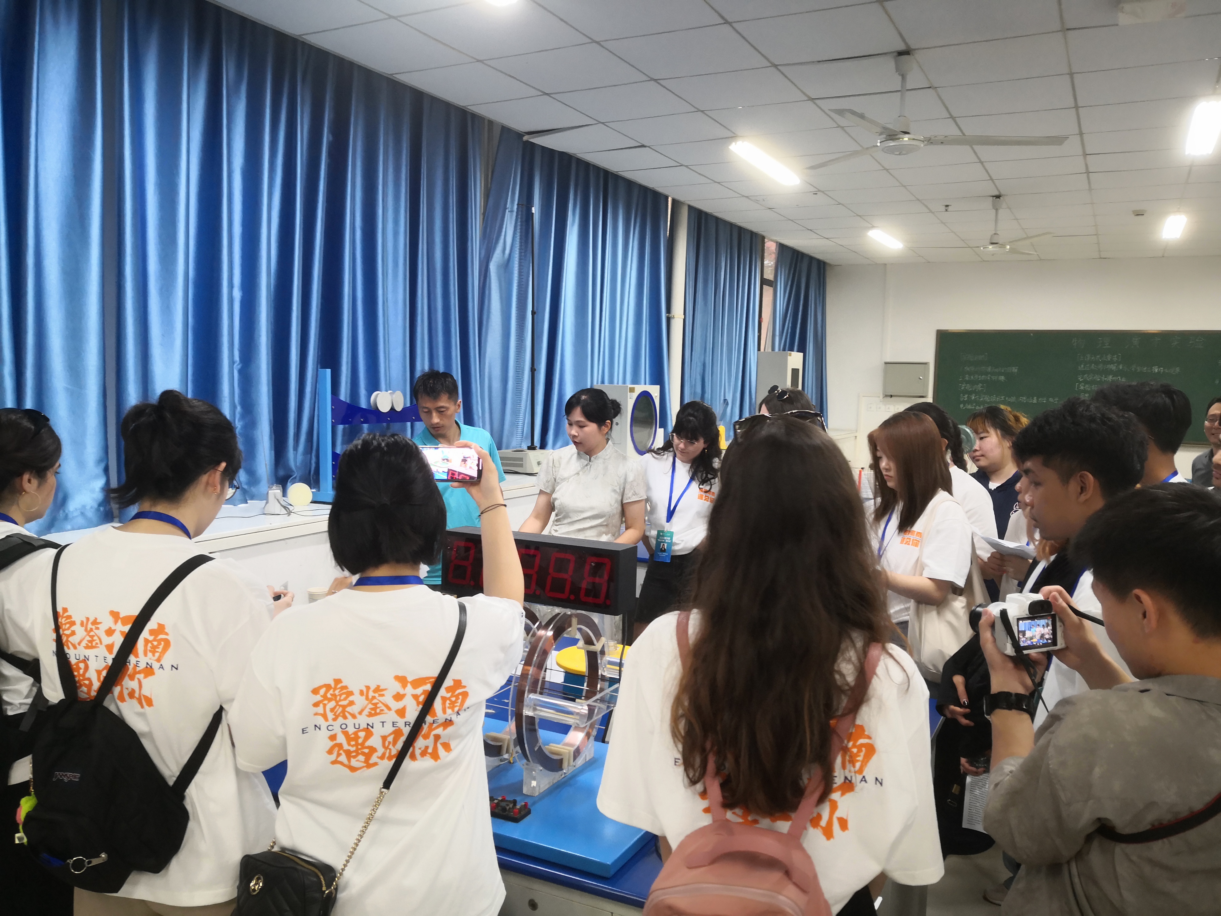 老师们首先用英文为夏令营学生分别讲解演示了大型辉光球、手触电池、温差电磁铁、避雷针、静电屏蔽、电风吹烛、直升机飞行原理、电磁阻尼、磁悬浮列车、陀螺进动、茹可夫斯基凳等趣味物理实验。随后,老师和同学们进行了交流互动,为学生演示了很多有趣的实验项目。最后,同学们对演示实验进行了实际操作和体验。此次活动使夏令营学生感受到了日常生活中的有趣物理现象,激发了同学们探索奇妙物理世界的极大兴趣。