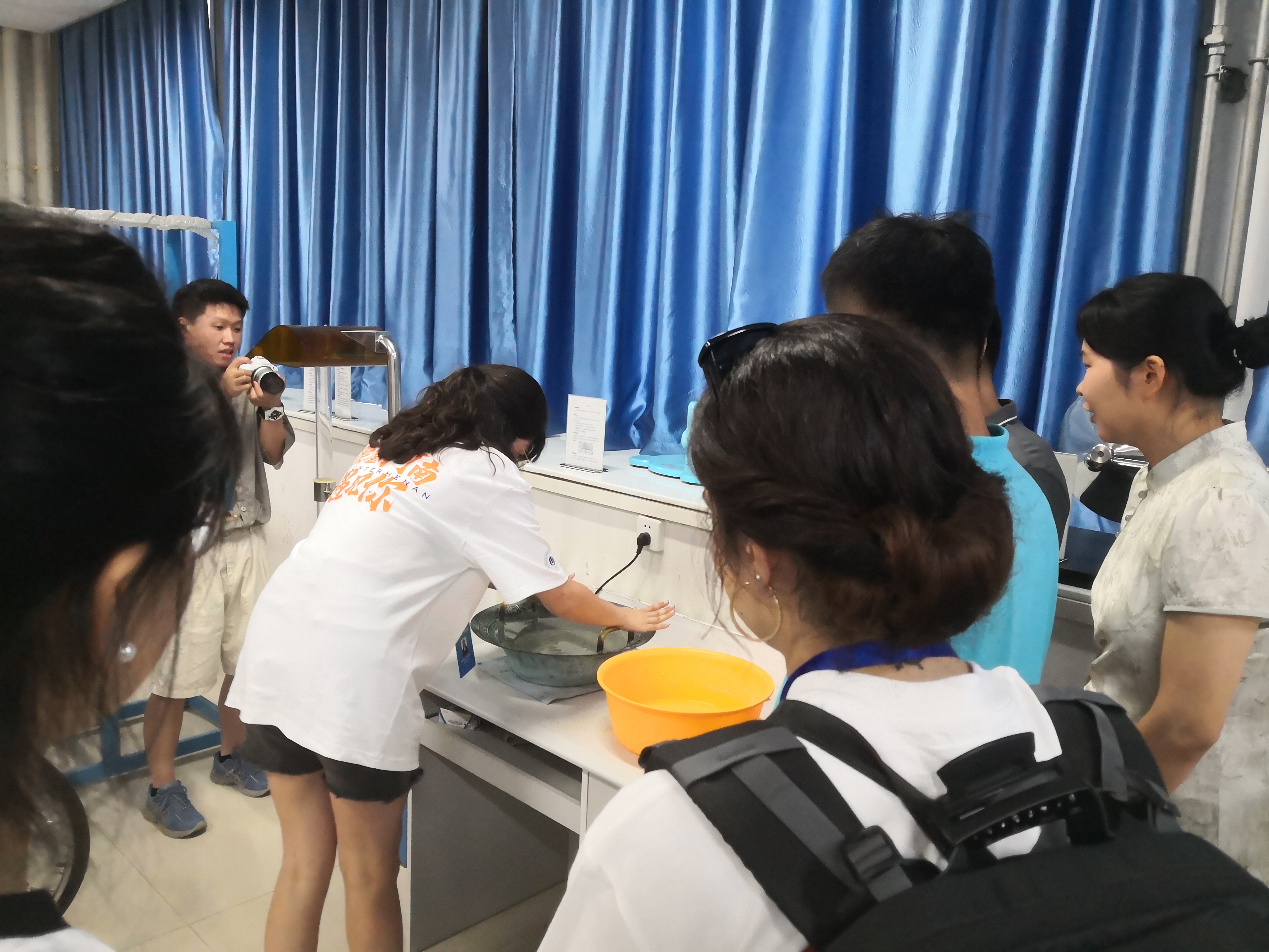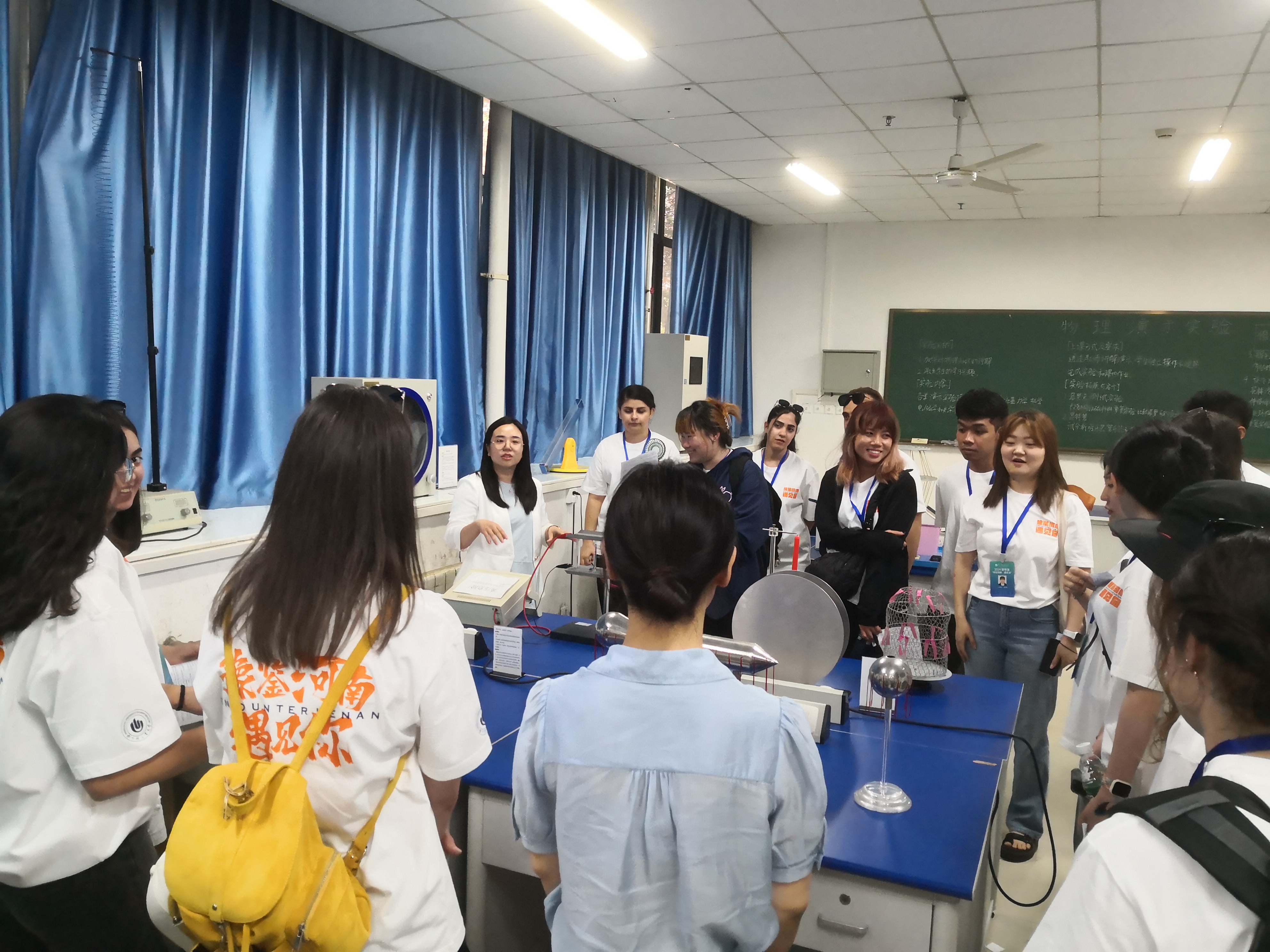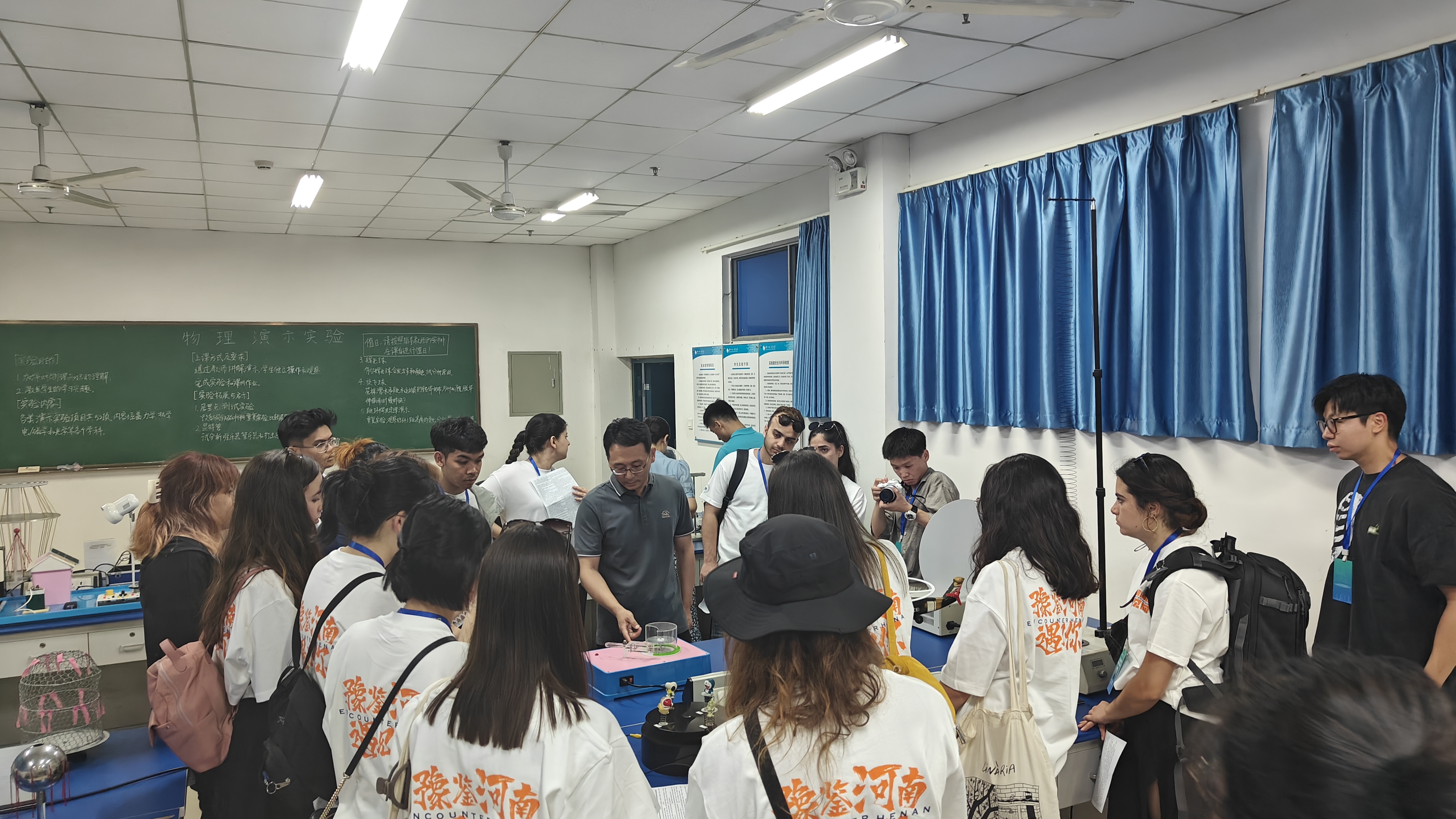 老师们首先用英文为夏令营学生分别讲解演示了大型辉光球、手触电池、温差电磁铁、避雷针、静电屏蔽、电风吹烛、直升机飞行原理、电磁阻尼、磁悬浮列车、陀螺进动、茹可夫斯基凳等趣味物理实验。随后,老师和同学们进行了交流互动,为学生演示了很多有趣的实验项目。最后,同学们对演示实验进行了实际操作和体验。此次活动使夏令营学生感受到了日常生活中的有趣物理现象,激发了同学们探索奇妙物理世界的极大兴趣。
