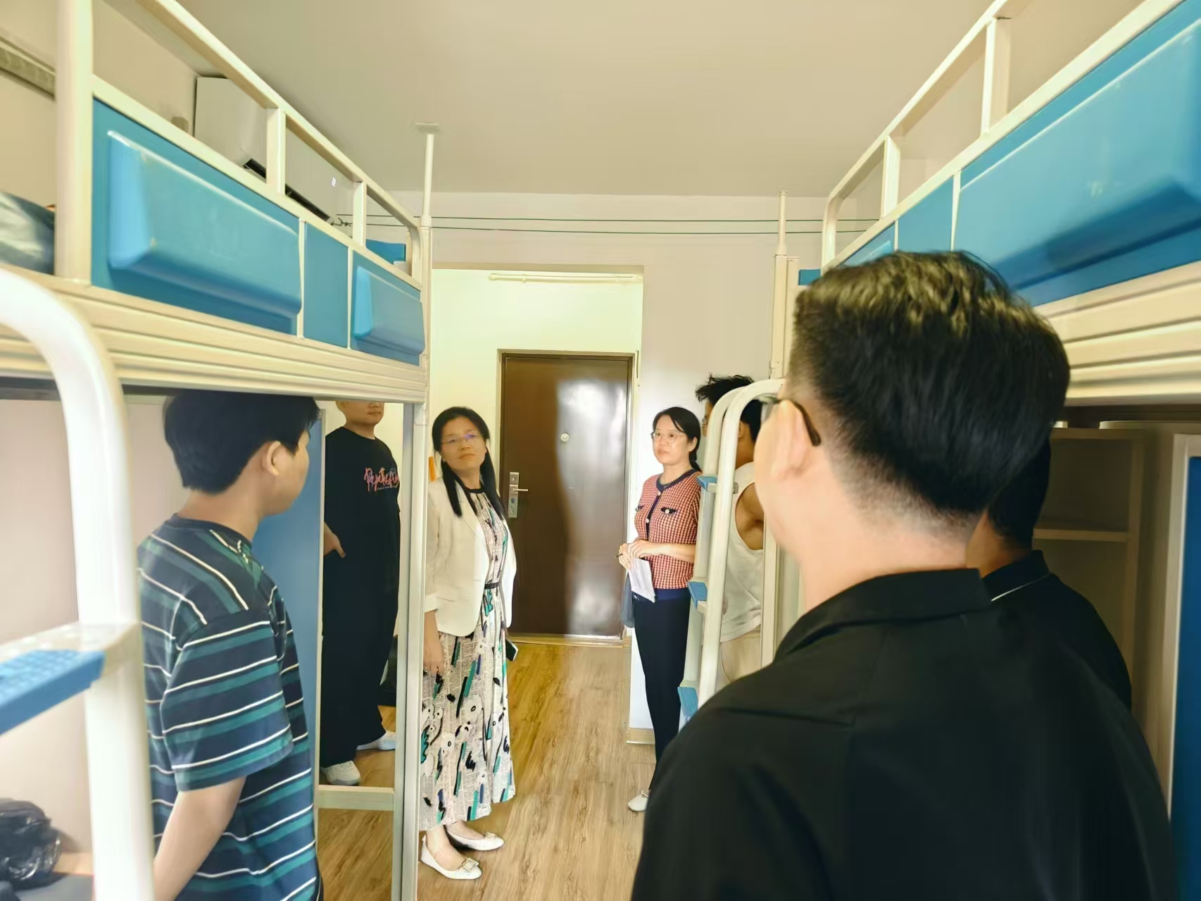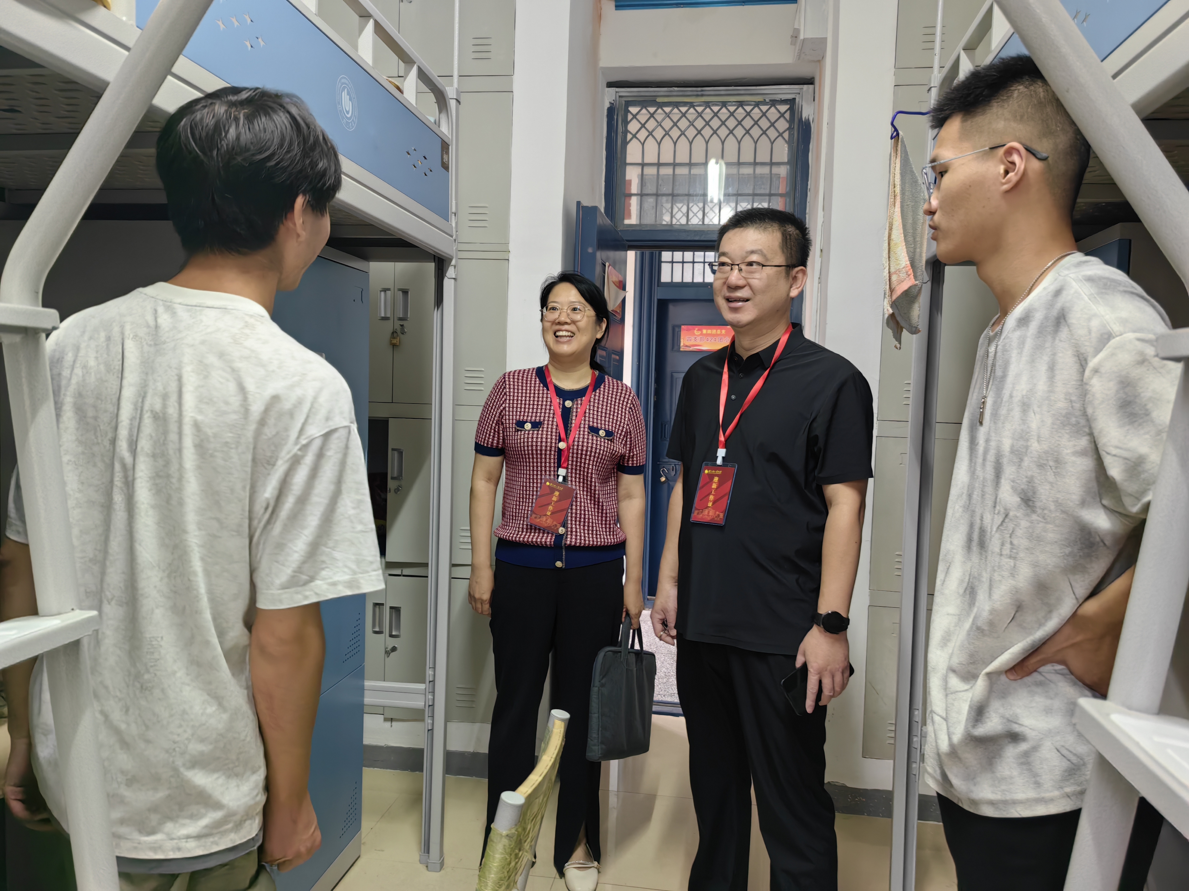 走访过程中,学院领导和老师对新生们逐一慰问,亲切地询问同学们报到是否顺利以及目前的生活适应情况,表达了学院对同学们的亲切关怀;叮嘱同学们要养成良好的生活作息,保持干净整洁的宿舍环境,以全新的精神面貌迎接校园生活;勉励同学们尽快转变角色,做好目标规划,珍惜美好的青春时光,扎实学好专业知识,努力提高综合素养,争做德智体美劳全面发展的时代新人。