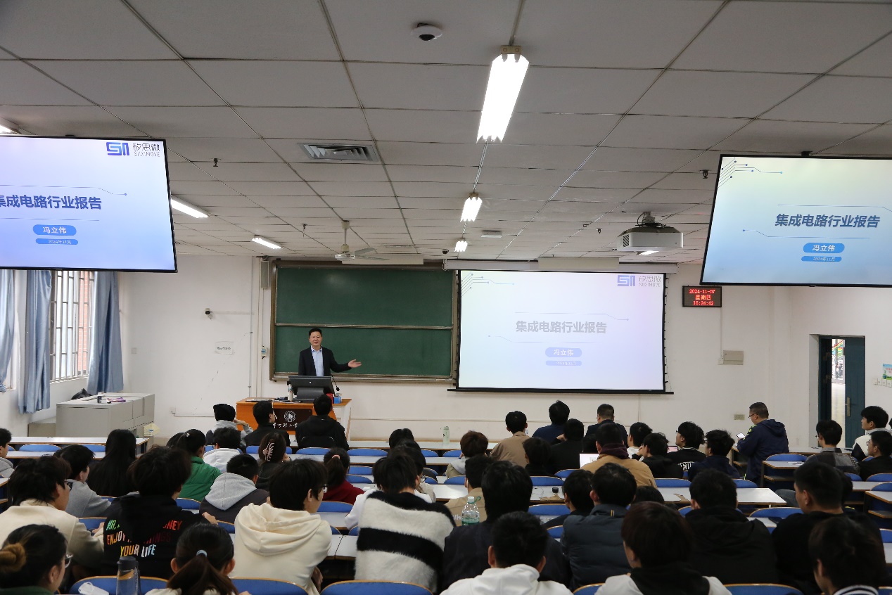 报告中,冯立伟以《集成电路行业报告》为题,从当前全球热点问题的中美博弈、华为芯片突破技术瓶颈为切入点,围绕集成电路的概念和原理,对集成电路行业发展态势、面临的挑战进行了深入浅出地讲解。随后介绍了河南矽思微电子有限公司的发展情况及岗位实习机会。报告会交流环节,冯立伟结合个人成长历程与参会学生进行了深入的交流和探讨,激励同学们勇于攀登高峰,在学术和实践中不断追求卓越。整场报告会生动有趣,引人入胜。